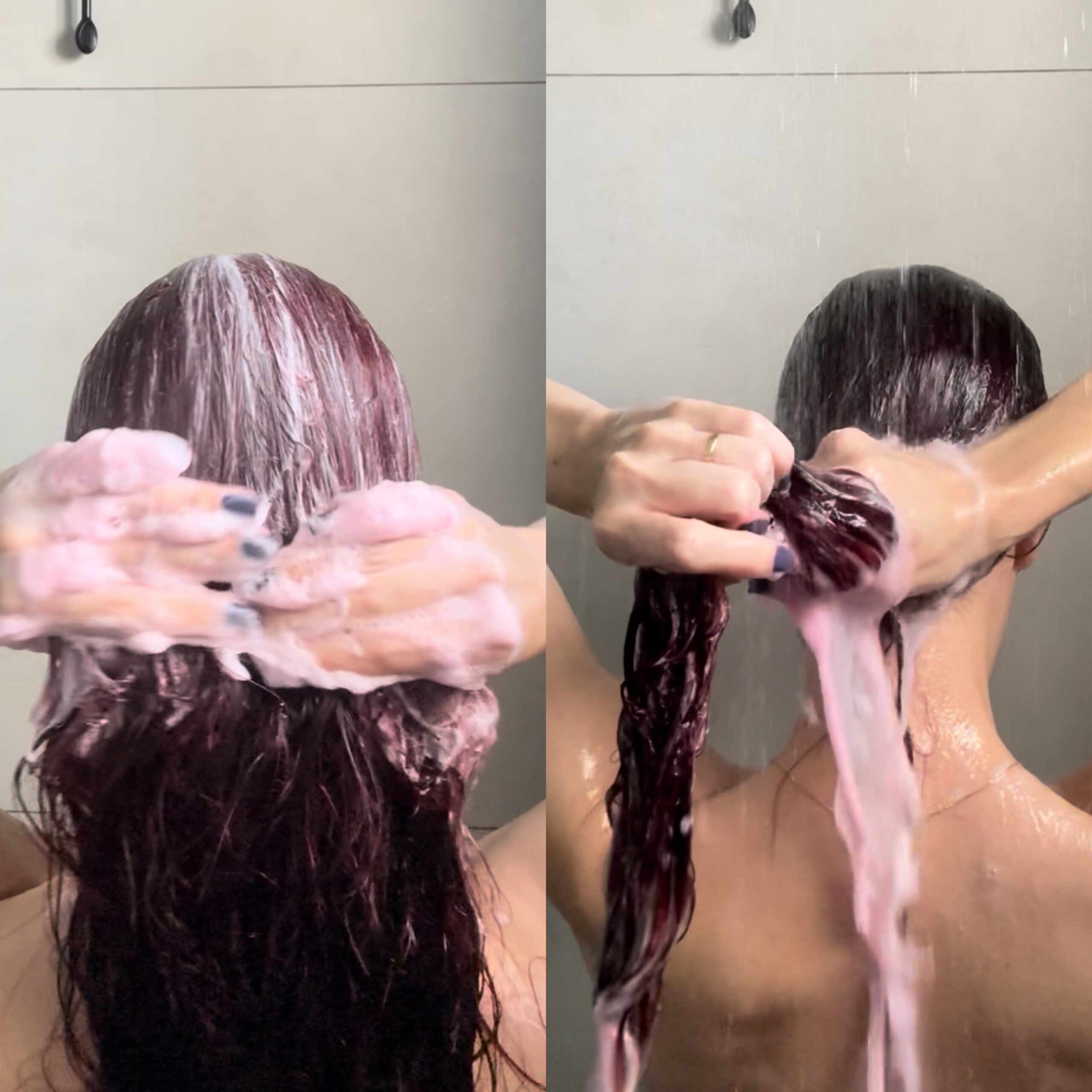 Uma dica é lavar o cabelo na água morna ou fria, para evitar o ressecamento e o desbotamento acelerado causado pela água quente. Após aplicar o shampoo somente no couro cabeludo e massagear bem, você pode segurar as pontas do cabelo para cima, pra que o excesso de espuma não percorra pelo comprimento. Isso ajuda a manter a cor do cabelo vibrante por mais tempo.
