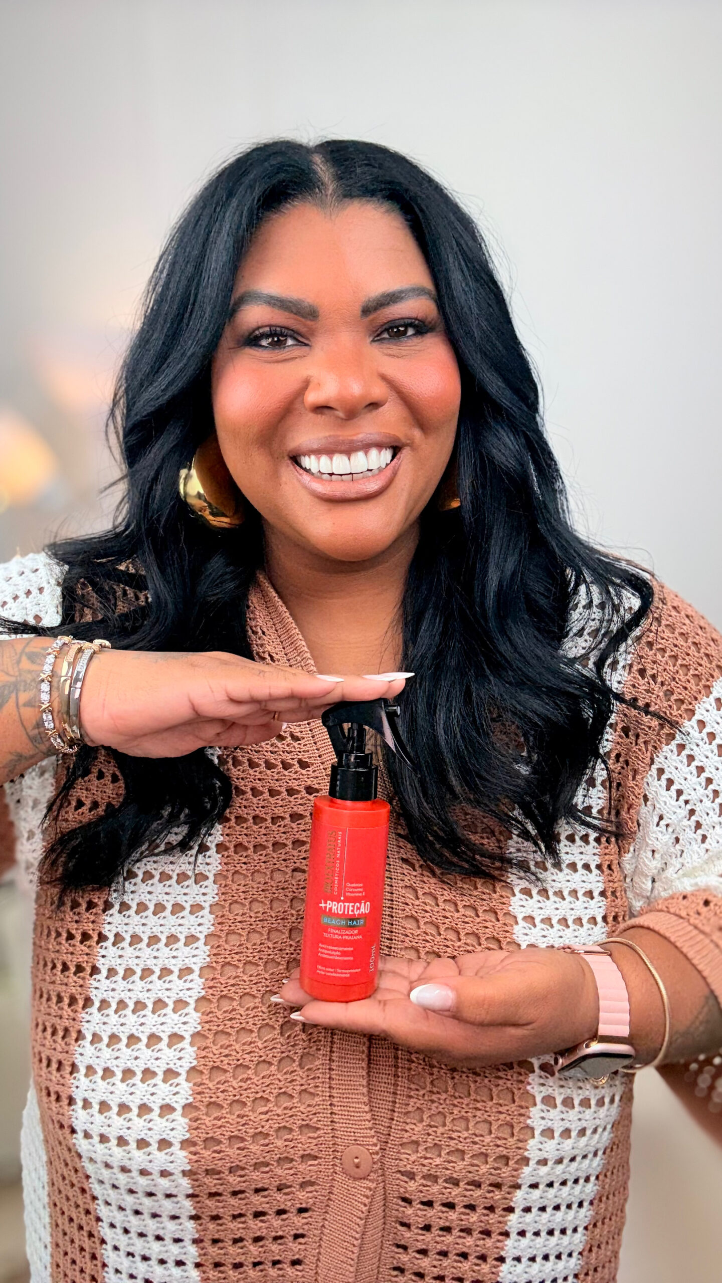 Após soltar o cabelo, gosto de aplicar um óleo ou cristal líquido só nas pontas. Isso devolve brilho, controla o frizz e deixa o cabelo com aparência mais saudável na hora. O meu favorito é o Cristal Líquido, pois ele sela as pontas do cabelo danificado, protege os fios e elimina o frizz. Contém filtro solar, que vai super proteger nosso cabelo, sendo ótimo também para levarmos em nossa bolsa de praia das férias!