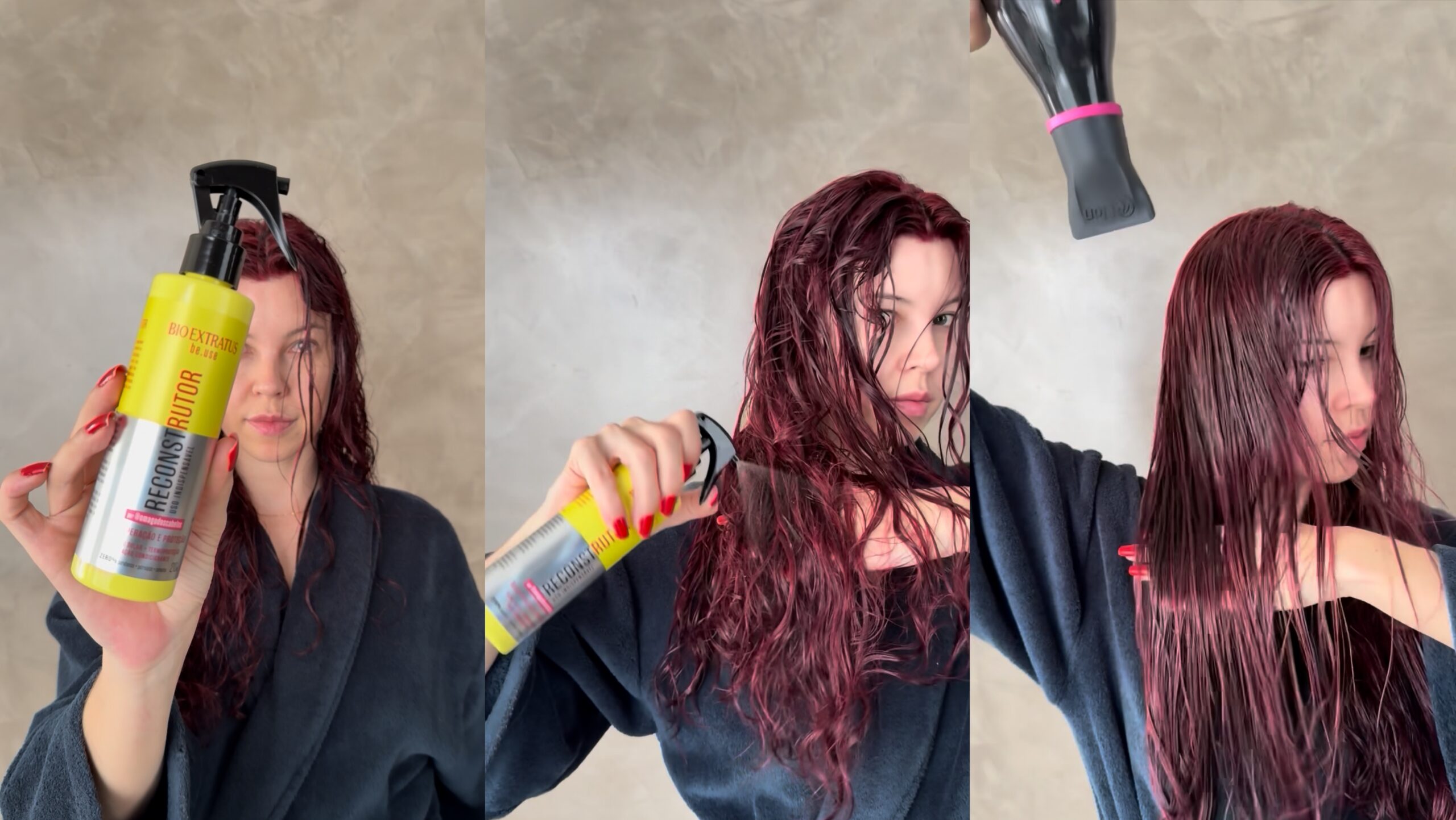 Depois do shampoo, eu uso o spray reconstrutor como máscara. Ele devolve vida, força e deixa o cabelo mais bonito sem esforço. Ele trata de verdade o cabelo em apenas 3 minutinhos. É tipo meu “truque secreto”.