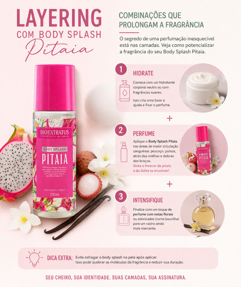 E quando falamos de frescor, leveza e um toque adocicado na medida certa, o Body Splash de Pitaia da Bio Extratus se torna o protagonista perfeito para essas combinações.